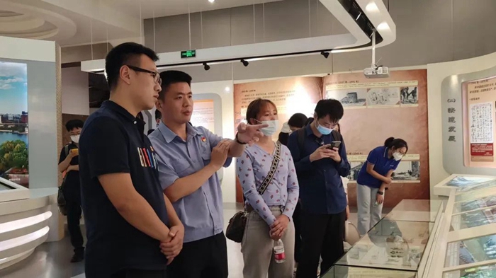 首钢集团团委书记毕鲁博和园区相关工作人员详细介绍了首钢园的发展历程及冷却塔、北京冬奥会滑雪大跳台、“三高炉”等网红打卡地相关情况。