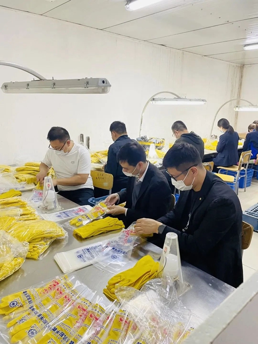团员青年们在实验生产线职工师傅的指导下,全身心投入到手套包装工作中,大家一干就是将近两个小时, 包装完成了2000余副手套。