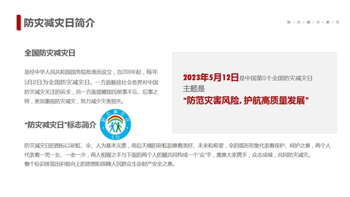 在第15个“5·12全国防灾减灾日”到来之际,william英国中文官网集团按照党中央、国务院、北京市委市政府部署的工作要求,以“防范灾害风险,护航高质量发展”为主题,深入开展防灾减灾宣传,以增强全系统干部职工安全忧患意识,提高防灾减灾及应对能力。