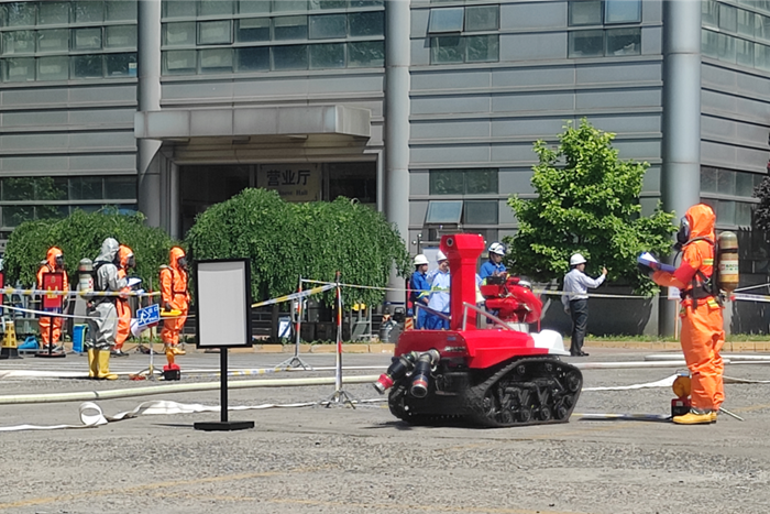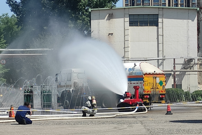 演练场景模拟北普公司院内两名恐怖分子劫持一辆满载液氧槽罐车冲撞氢气瓶组存放区,造成液氧槽罐车车头着火,部分高压氢气瓶泄漏、受热存在潜在爆炸风险。现场两名人员受伤,驾驶室内恐怖分子被困,现场情况不明。