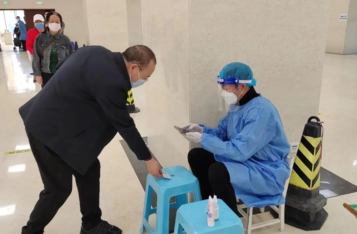 曾担任过第一书记的共产党员王唯良在北京新天地社区进行核酸检测队伍疏导或信息录入工作。