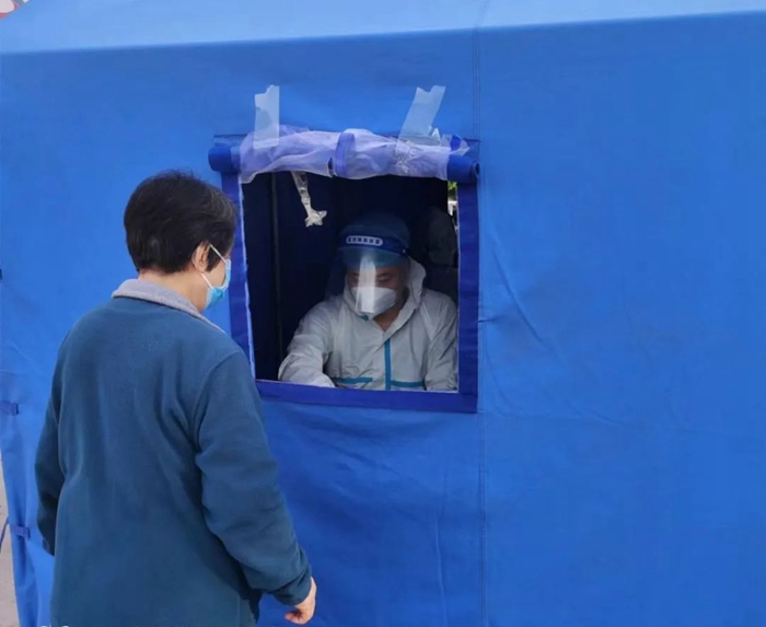 共产党员冀高娜在朝阳区兴隆社区参加核酸检测志愿服务。