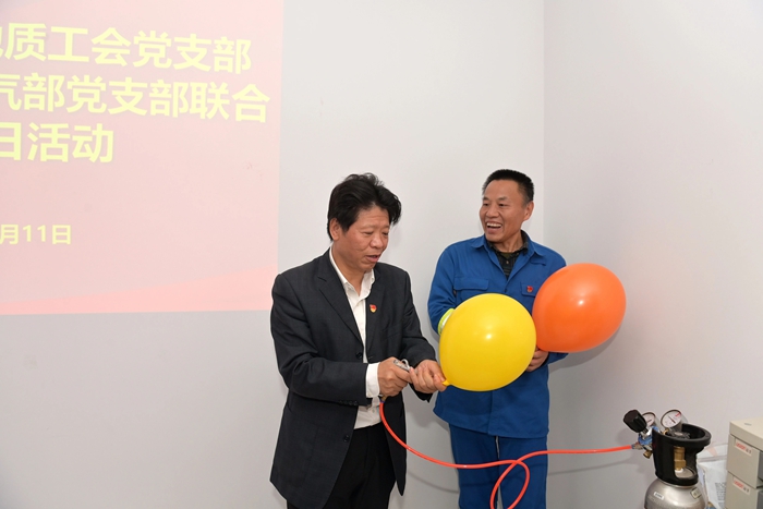 在交流中,北普公司包装气部党支部书记王绍武介绍了工厂生产运行情况,并重点汇报了包装气党支部全体党员为高质量完成此次服务保障任务,及时成立临时党支部,强化党建引领,发挥战斗堡垒作用;党员同志们从生产、运输、现场操作,到落实安全流程、人员培训,始终发挥先锋模范作用,以硬核担当带领一线骨干,把好操作关、守好安全线,最终圆满完成保障任务的感人经历。中国能源化学地质工会党支部的党员同志们还在现场人员指导下,亲手进行气球充装,亲身感受重大活动服务保障中的紧张氛围。